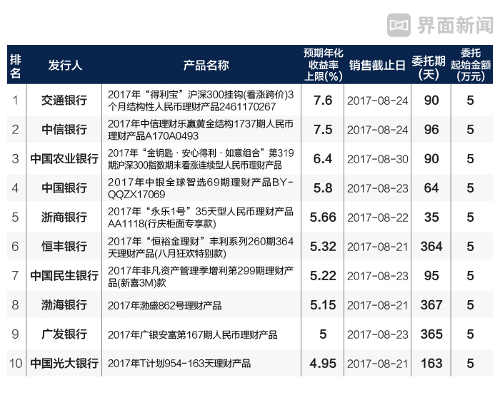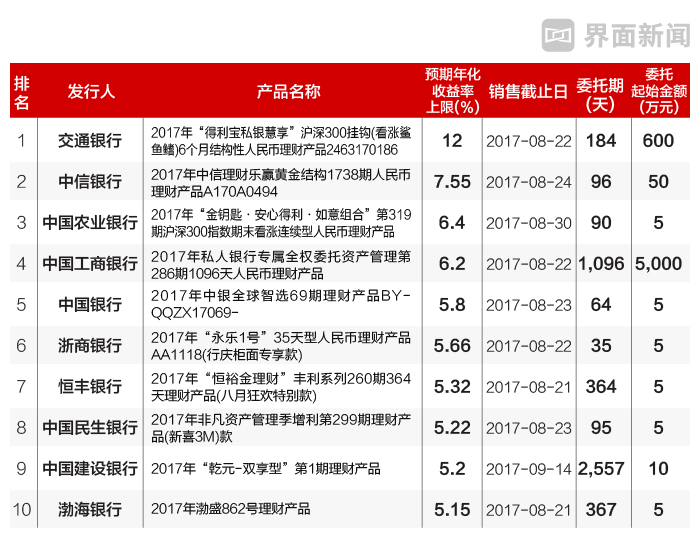 来看看本周有哪些可以挑选的银行理财产品,本周,17家国有商业银行和股份制商业银行全国范围发售针对个人的人民币理财产品240只,界面新闻从每家筛选了收益率最高、最值得关注的理财产品,共10只。