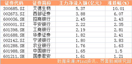 今日银行股、券商股集体走强。主力净流入十大个股中,银行股、券商股瓜分了9个席位。西部证券(002673.SZ)今日成为主力资金追逐的焦点,逾3.88亿元主力资金大举杀入,盘中该股一度逼近涨停,尾盘小幅滑落后亦收涨6.07%。五大行之中有三位上榜净流入前十,工商银行(601398.SH)、农业银行(601288.SH)、中国银行(601988.SH)分别实现2.19亿元、1.76亿元、1.65亿元的主力资金净流入。而华泰证券(601688.SH)、国泰君安(601211.SH)等两枚券商龙头股亦获主力资金抢筹,其主力净流入额分别为1.82亿元、1.61亿元。此外,今日拔得头筹的是一只次新股——艾德生物(300685.SZ),其主力净流入额为5.37亿元。该股自上市以来已经连续获得14个涨停板,今日首度打开涨停板后迅即又封死涨停,报收83.44元/股。