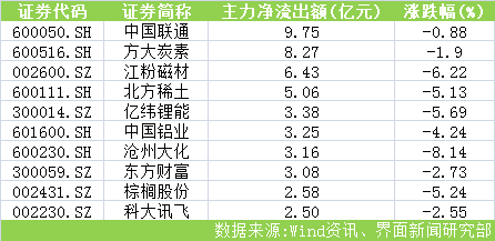 中国联通(600050.SH)自公布混改方案后,连续两日实现涨停,而今日不仅遭遇高达9.75亿元主力资金净流出,其股价亦跌了0.88%。“妖股”方大炭素(600516.SH)今日遭遇下挫,以8.27亿元的主力净流出额紧随中国联通之后。今日周期股四面楚歌,江粉磁材(002600.SZ)、北方稀土(600111.SH)、中国铝业(601600.SH)均遭遇主力大幅抛售,其主力净流出额分别为6.43亿元、5.06亿元、3.25亿元。此外,科大讯飞已连续6个交易日遭遇主力抛售,今日又净流出2.50亿元。