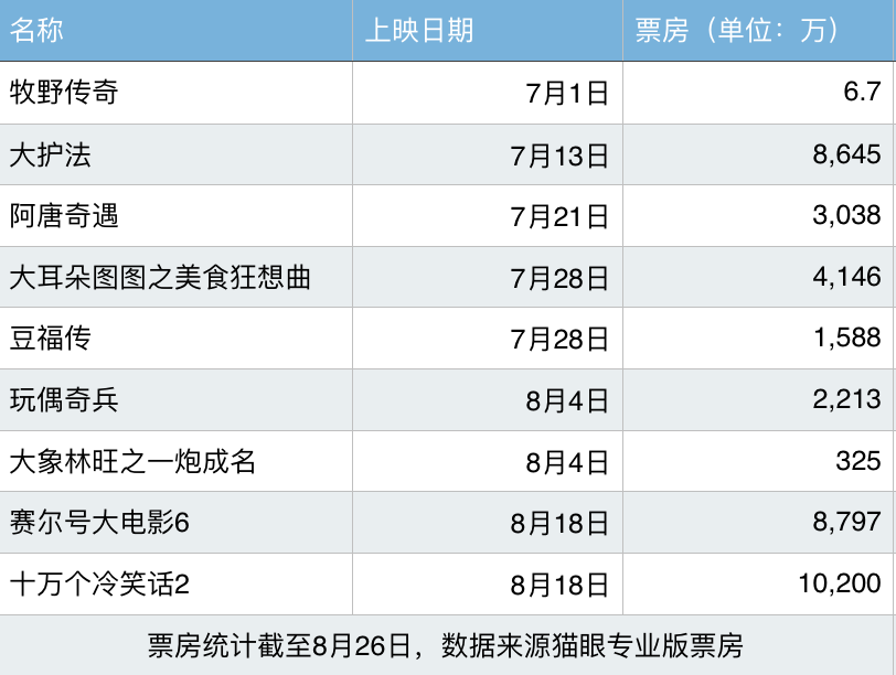 “‘我就是痛,痛就是我。’不甘心地睡了。心想,不能超越别人,明天就先逆袭下自己吧。”这是光线总裁王长田在7月16日凌晨所发布的微博内容,字里行间里直接表达了对《大护法》票房不佳的不甘心。过去两年光线出品的两部“大”字头动画电影都取得上佳的票房,然而今年的《大护法》却没能延续这样的成绩。尽管口碑不俗,但在排片和票房上,面对同期上映的《神偷奶爸3》都毫无还手之力。然而暑期档叫好不叫座的并不止《大护法》一部,由国产恶搞动画剧集改编的大电影续作《十万个冷笑话2》,在口碑明显好于前作和同档期作品的情况,目前票房却刚刚破亿,由于25日之后大批好莱坞电影的上映,排片量陡降的情况下,票房甚至可能不及前作。