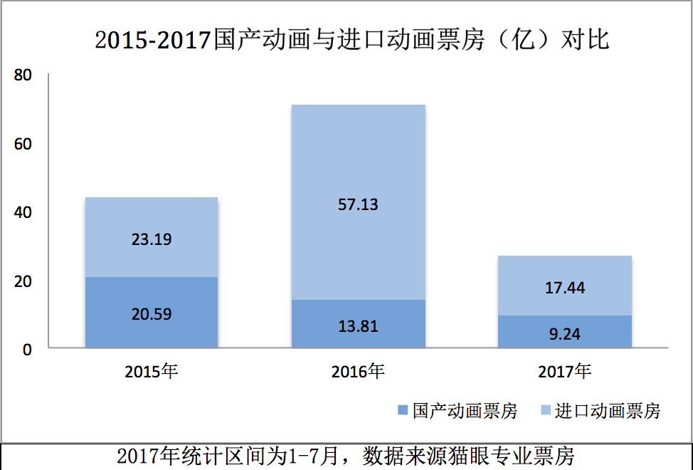 在国产动画电影最为看重的春节档和暑期档,前者最近两年完全依靠“熊出没”大电影在独挑大梁,去年与今年分别收获了超过2亿和5亿的票房。然而暑期档则没有这般幸运,去年暑期档在仍有多部进口动画电影的情况下,《大鱼海棠》依然能够斩获近6亿票房。然而到了2017年的暑期档,在较去年更严格执行国产保护的情况下,放眼望去暑期档的一众国产动画却一个能打的都没有,无论题材是原创作品或者IP改编,风格是成人向还是合家欢,国产动画电影都再难吸引观众买票支持。暑期档如此乏力导致的直接结果便是,今年至今上映的29部国产动画电影,整体票房甚至不及一部《神偷奶爸3》。