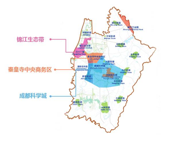“双核共兴”的其中一级核位于天府新区成都直管区,是天府新区发展的重中之重。根据建设目标, “一城、一区、一带”将作为重点发展区域,打造成都科学城、秦皇寺中央商务区、锦江生态带,形成产业、都市、生活三位一体的现代化新城。