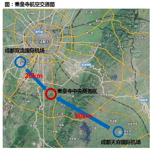 对外:距成都双流国际机场和天府国际机场均只有半小时车程。其中,天府国际机场定位为国家级国际航空枢纽、丝绸之路经济带中等级最高的航空港,将负责成都出港的全部国际航线。