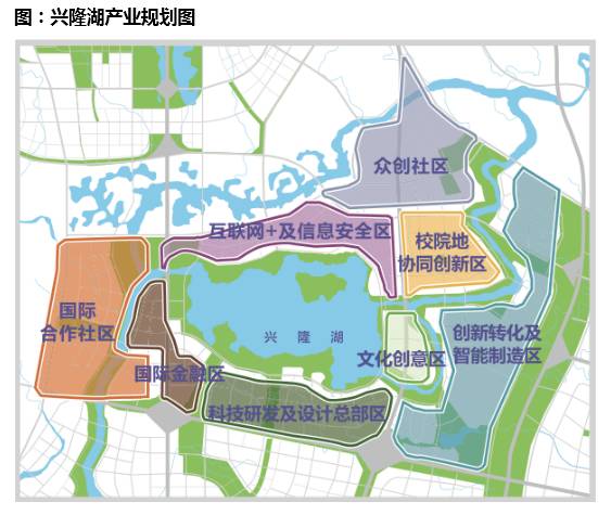 布局:兴隆湖规划打造面积为25平方公里,环湖规划研发兼容居住、商业、商务用地,包括互联网产业、金融产业、科技设计研发、产业孵化等板块。在兴隆湖东部规划创新转化园,专门用于科研成果转化。