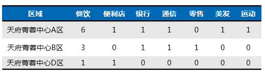 由于天府菁蓉中心A、B区是最早建成投入使用的项目,所以底商零星分布在该区域。底商业态主要以餐饮为主,引入中国农业银行、中国银行、中国电信、中国移动等生活配套业态,除此之外还有运动健身会所和理发店,满足办公人群的基本消费需求。