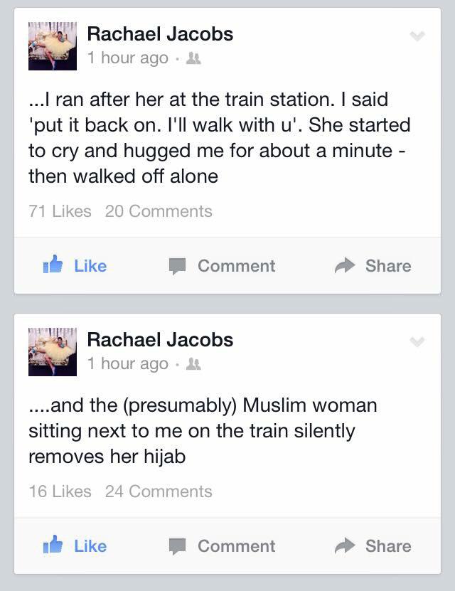 “……在车上,坐在我身边的穆斯林妇女默默地取下了她的头巾。下了车我追上了她。我说‘把它带上吧,我和你一起走。’她开始哭泣,拥抱了我有整整一分钟,然后独自走开了。”