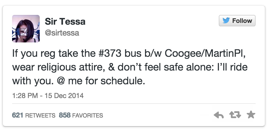 “如果你经常乘坐373路公交往返于Coogee和Martin广场,穿着宗教服装,并且觉得可能会不安全的话,@我你的行程,我会与你同行。”