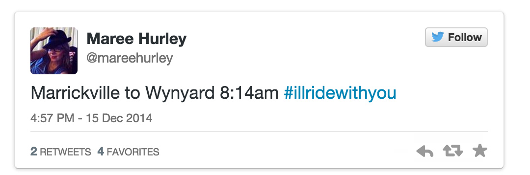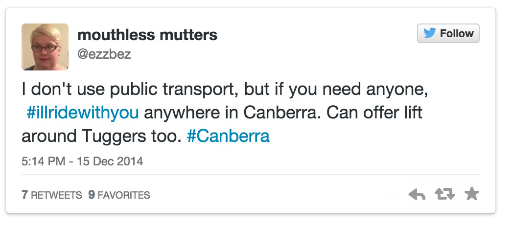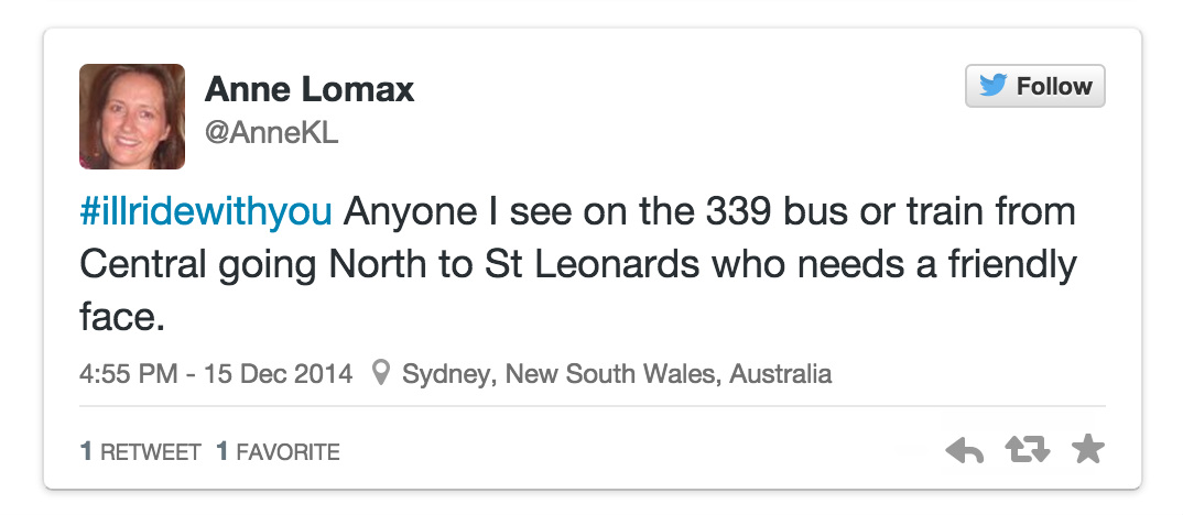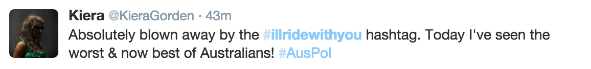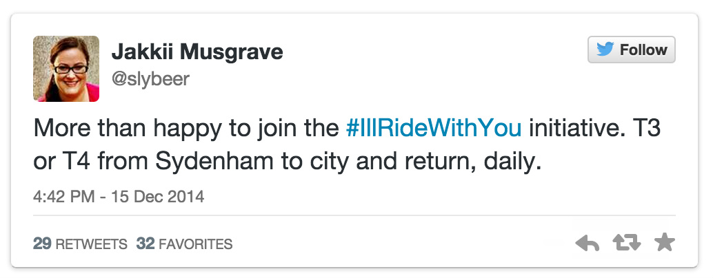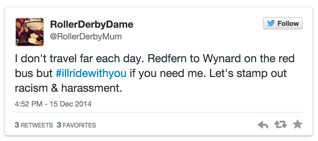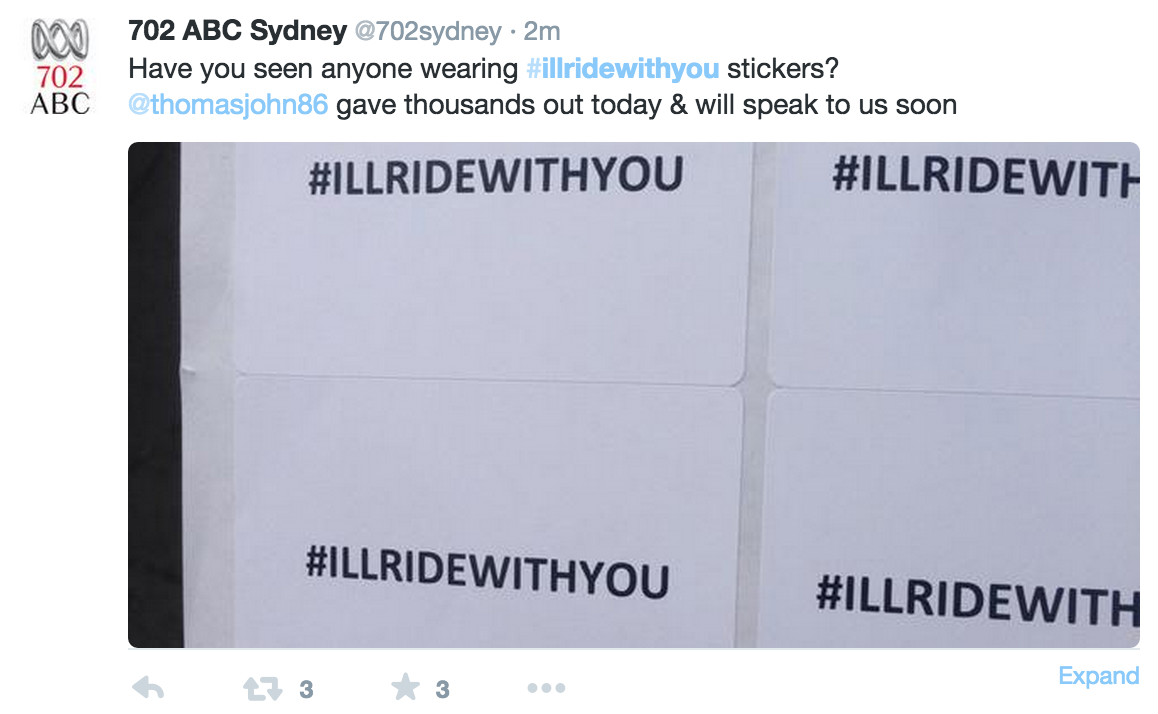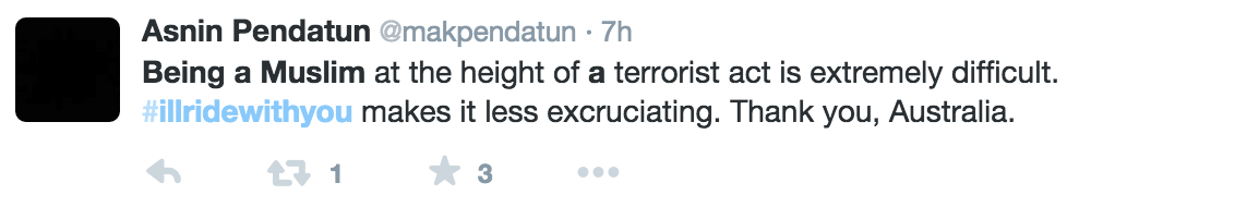 为了避免公众有可能将气愤发泄在同样是穆斯林的其他澳大利亚居民身上,从周一开始,在twitter上一场名为#Iwillridewithyou(#让我与你同行#)的运动很快流行了起来。