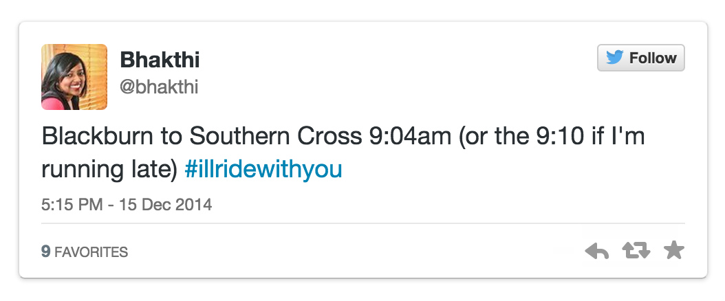 “早上9点04分从Blackburn去Southern Cross。(或者是9点10分,如果我迟到了的话)#让我与你同行#”