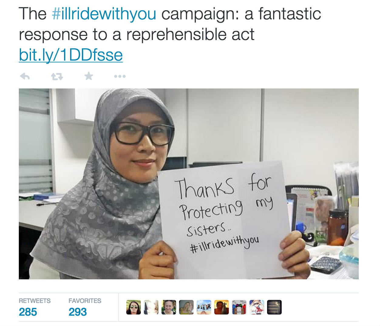 “我是一个穆斯林,我想拥抱每一个转发这个标签的人。#让我与你同行# 很温暖,人性仍然存在。”