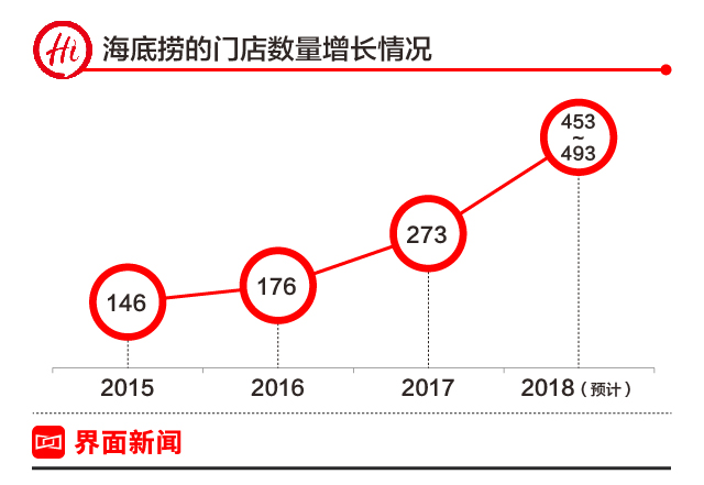 海底捞计划将于2018年新开453-493家店,而目前海底捞总共有320家店,其中296家在内地。招股书中并没有明确2018年新开的店将会在海内外如何分配,但我们假设同样为9成在国内,将开在国内的新店也将超过400家——即海底捞在国内的门店数量将在2018年翻番。
