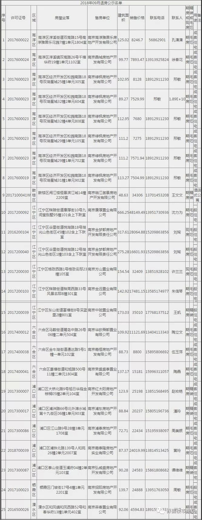 9月17日,南京网上房地产公布了9月退房名单。共有25套退房,其中江宁6套、江北8套、城北2套、高淳8套、溧水1套。将于9月28日下午3点,在江苏省南京市南京公证处举行现场直播摇号。