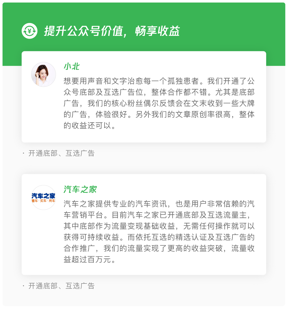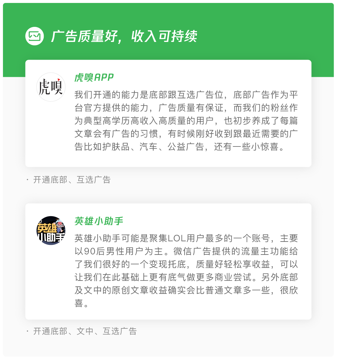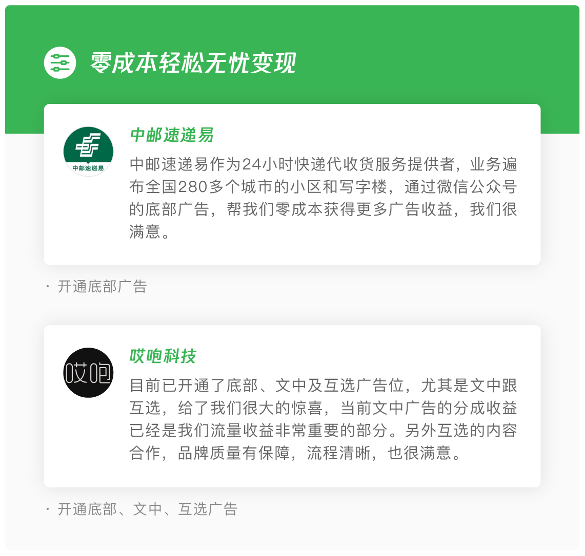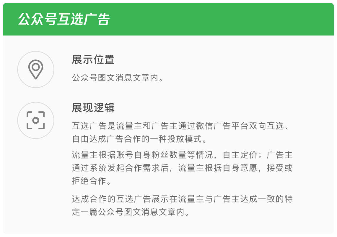 互选广告,主要针对文章维度的品牌内容合作,包括广告推荐及内容定制两种合作模式,互选广告由广告主与流量主双方互选,流量主可以选择贴合公众号内容风格的品牌进行合作,有效发挥优质原创账号的内容影响力,单次合作收益更高。同时可以通过积累优秀的品牌合作案例,提升流量主的账号影响力。互选广告,可以作为优质流量主流量变现的有力补充。