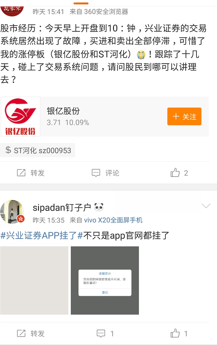 综合网友反馈情况来看,故障发生的时间集中在上午开盘后至上午11点左右。有网友声称,除了App外,网页端也同样出现无法登陆的问题。“手机的交易系统无法使用,PC端的同花顺版深交所有部分时间段无法使用,PC端的通达信版有无法撤单现象”。还有网友表示,由于无法进行操作导致损失惨重,要求兴业证券赔偿。