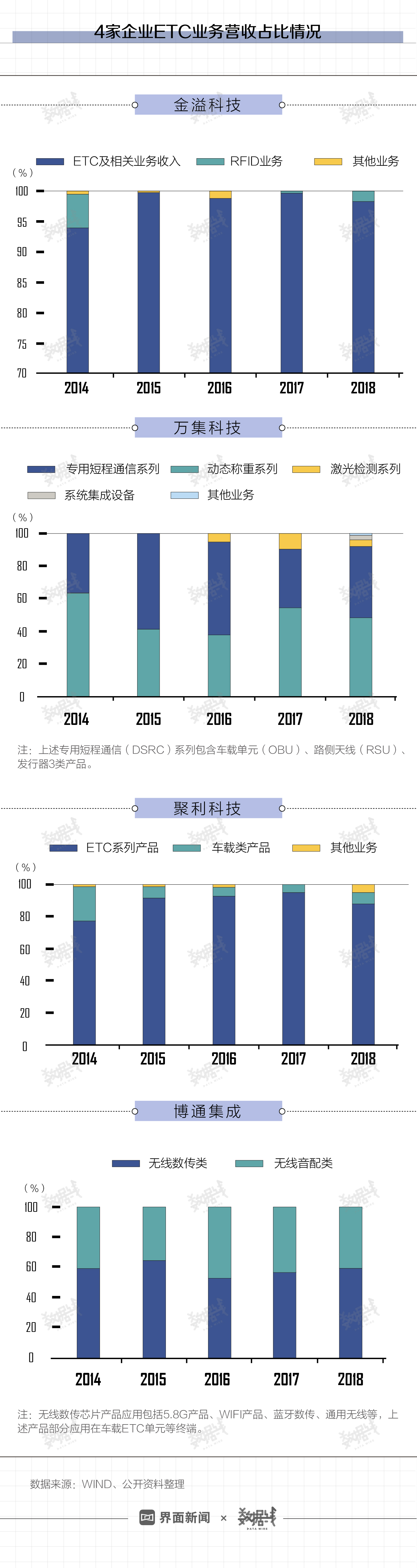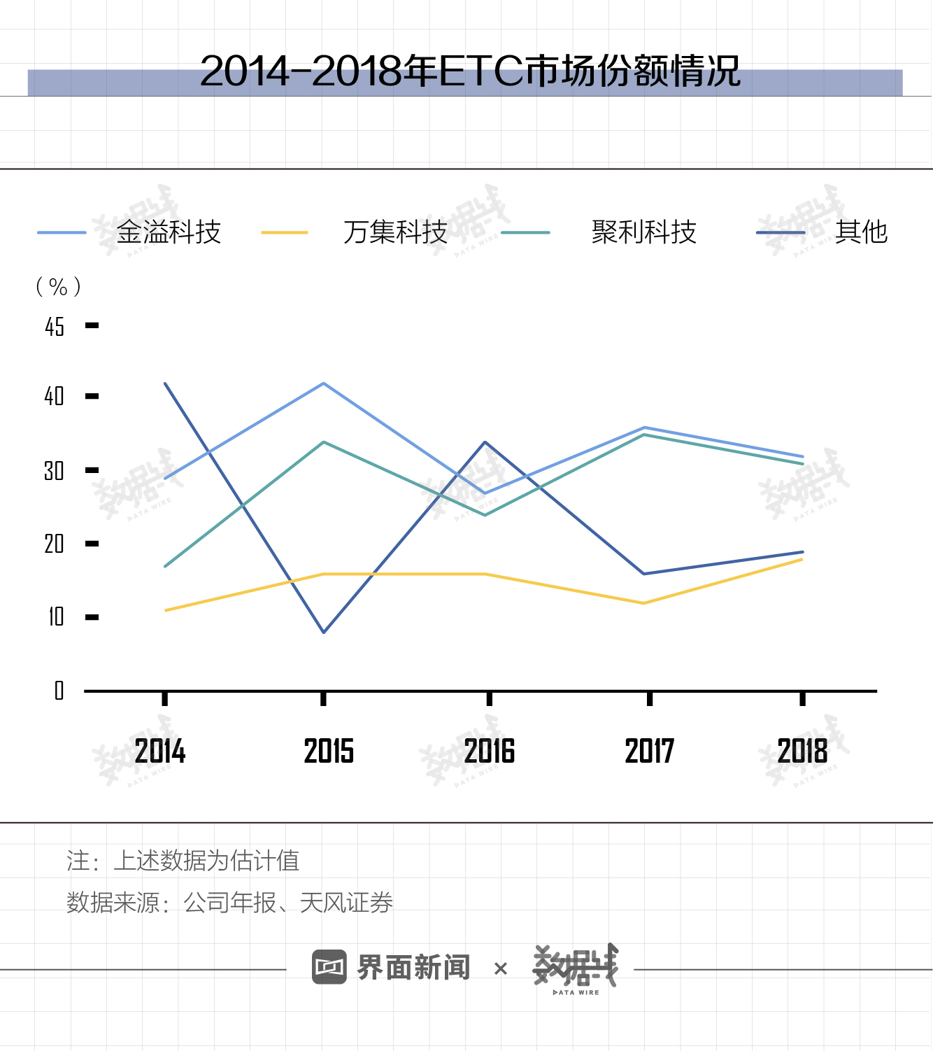 ETC的走红,也带火了相关企业。在ETC市场,金溢科技、万集科技、聚利科技是三大龙头企业。据天风证券估算,2018年三家企业ETC市场份额占比总计达到80%以上。