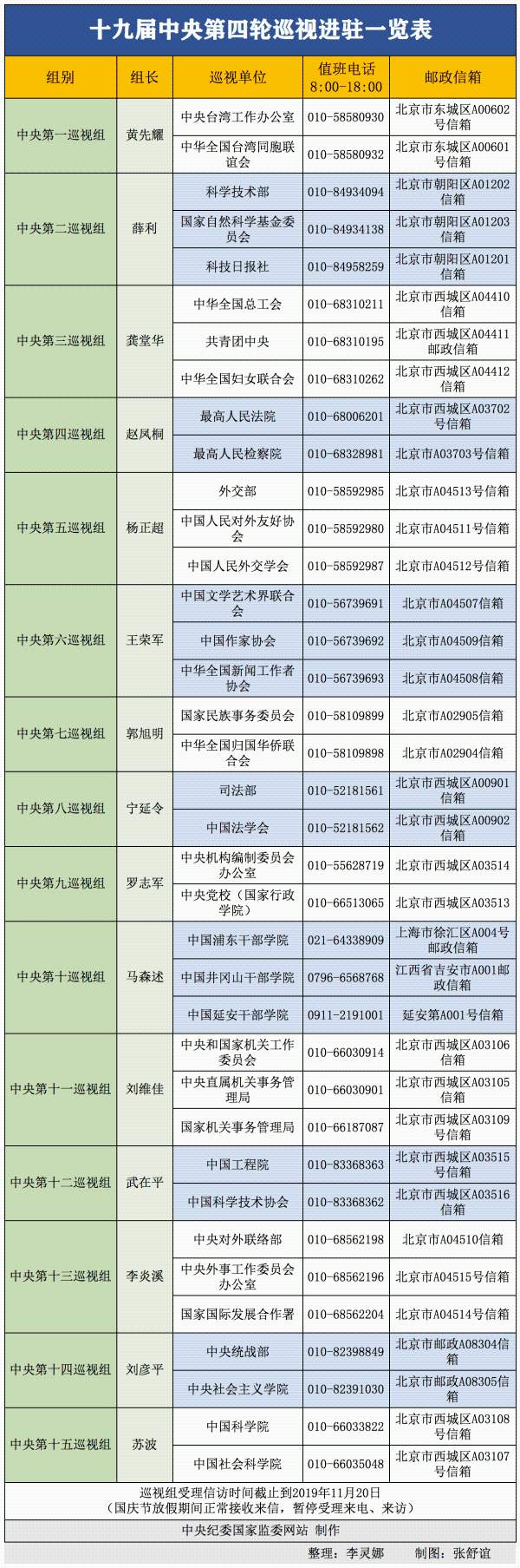 据悉,中央巡视组将在被巡视单位工作2个月左右。巡视期间设专门值班电话、专门邮政信箱。巡视组受理信访时间截止到2019年11月20日(国庆节放假期间正常接收来信,暂停受理来电、来访)。根据巡视工作条例规定,中央巡视组主要受理被巡视单位党组领导班子及其成员、下一级党组织领导班子主要负责人和重要岗位领导干部问题的来信来电来访,重点是关于违反政治纪律、组织纪律、廉洁纪律、群众纪律、工作纪律和生活纪律等方面的举报和反映。其他不属于巡视受理范围的信访问题,将按规定由被巡视单位和有关部门认真处理。