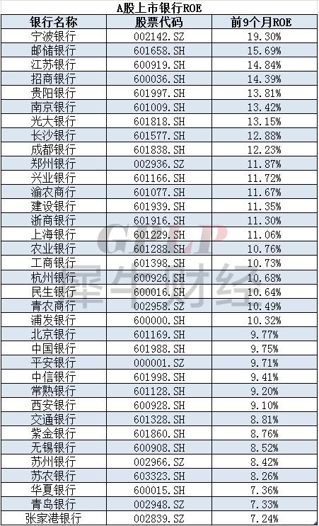 35家A股上市银行净资产收益率排名中,宁波银行、邮储银行、江苏银行(600919.SH)名列前三名;华夏银行、青岛银行、张家港行(002839.SZ)排在末尾3位。