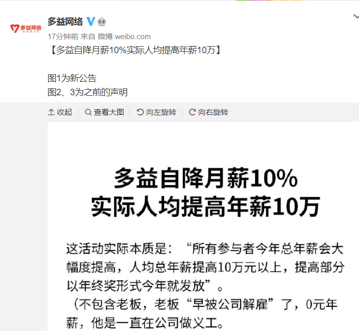 11月11日晚,@多益网络 再发声明称,这次活动实际本质是:“所有参与者今年总年薪大幅度提高,人均总年薪提高10万元以上,提高部分以年终奖形式今年就发放”。声明还称,本次活动不包含老板,因为老板“早被公司解雇”了,他一直在公司做义工。