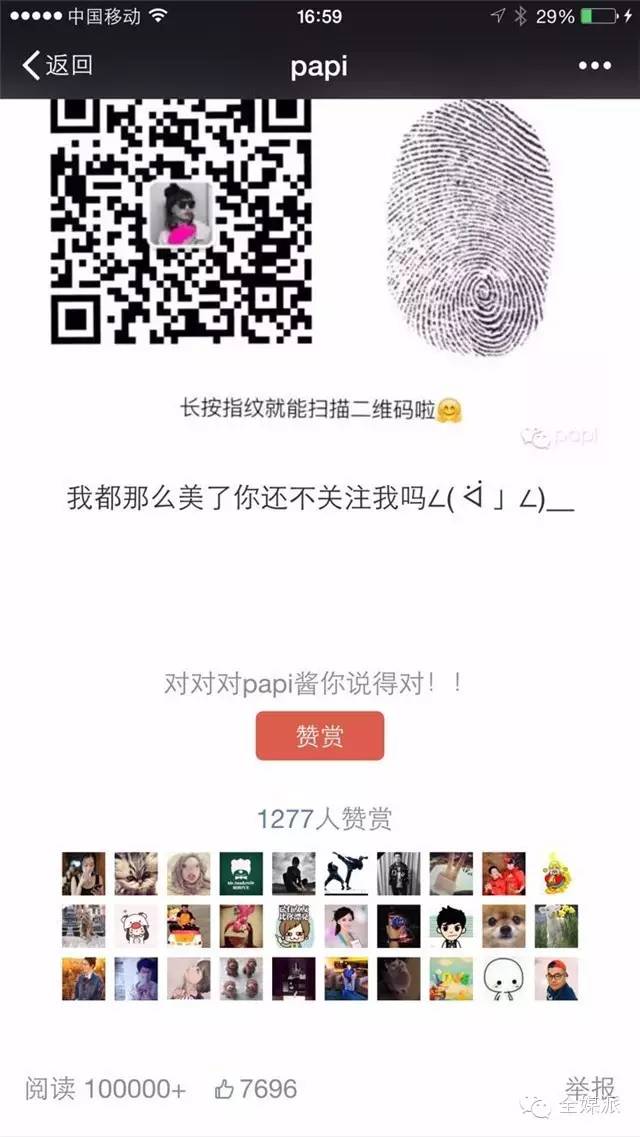 以1月18日推送的《papi酱吐槽 | 微信有时候真让我崩溃》为例,阅读数10W+,点赞数超过7000,赞赏人数更是超过1200人。