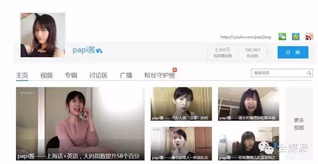 优酷视频:在优酷视频上,papi酱共发布31个视频,总播放量达2595万。