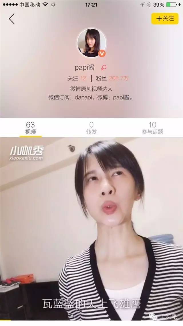 秒拍:在短视频应用秒拍上,papi酱的粉丝人数同样超过200万。