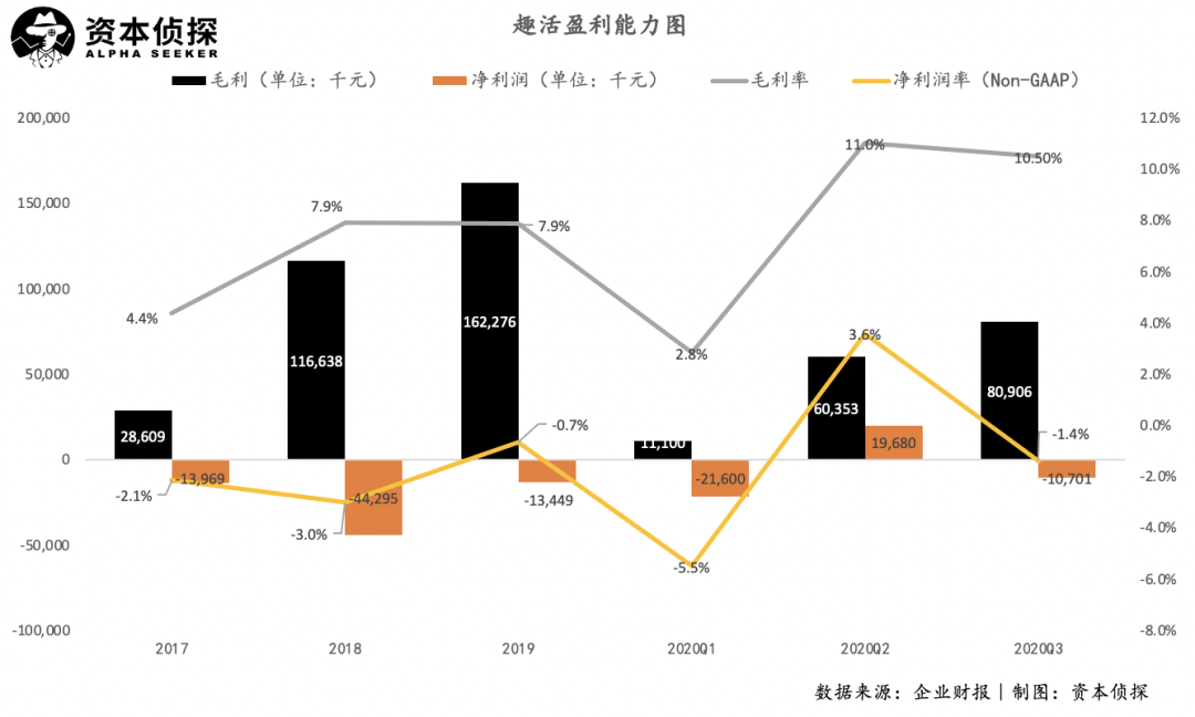 今年上半年,尤其是一季度,严峻的疫情形势下餐饮外卖行业表现不佳。在这一背景下,趣活一季度各项业绩数据皆出现大幅度滑坡,且在第二季度,趣活毛利率继续下滑。随着疫情缓和,趣活三季度的表现终于走回增长轨道,但增速放缓、营收结构单一的问题依旧没有明显改善。