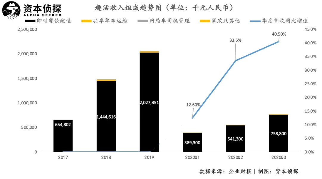 三季度,趣活实现营收7.7亿人民币,同比增长20.8%,其中即时餐饮配送业务占比98.6%;