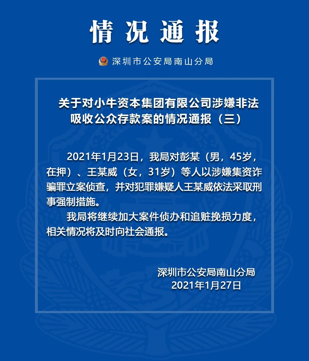1月27日,“深圳南山公安”微信公众号发布关于对小牛资本涉嫌非法吸收公众存款案的情况通报。通报称,1月23日,深圳市公安南山分局对彭某(男,45岁,在押)、王某威(女、31岁)等人以涉嫌集资诈骗罪立案侦查,并对犯罪嫌疑人王某威依法采取刑事强制措施。