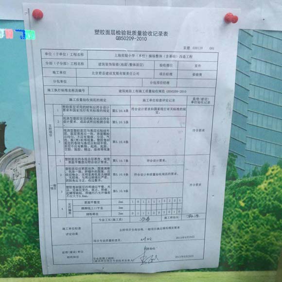 但塑胶面层检验批质量验收记录表显示,该项目早在2015年9月29日就已通过验收,记录表上有施工单位和监理(建设)单位负责人的签字。