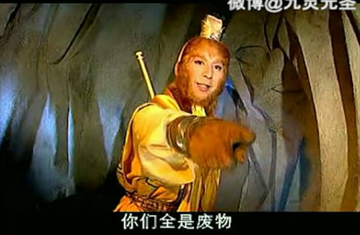 剧本里猴哥这样嚣张到狂妄的台词比比皆是。这同样也是《西游记后传》给它的后继者们撂下的狠话。▼