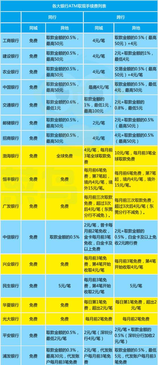 3、股份制银行在政府指导价的基础之上,都给予了一定的优惠,尤其是渤海、广发、恒丰、兴业、华夏、光大都有免收政策,只要不是遇到特殊情况需要频繁取现,基本是够用的!