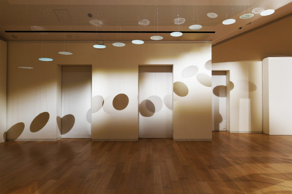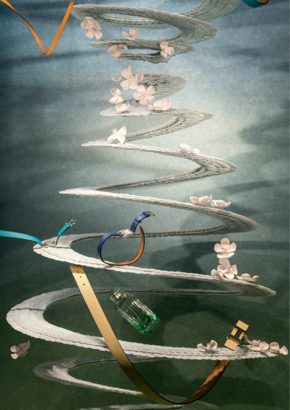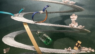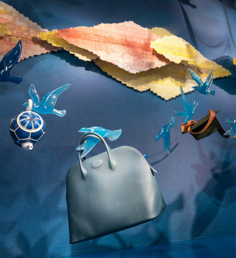 上海“爱马仕之家”2016冬季橱窗于11月24日揭幕,今年爱马仕的冬季橱窗主题为“映”,由新锐陶瓷艺术家辛瑶遥打造,她以自然界中水的不同存在方式为创作主线,将冬季橱窗变为表达水面倒影美感与色彩的自然空间,在创作手法上,她使用了几何形状与薄为1毫米的瓷片单元组合进行创作,静态诠释动态的漩涡、涟漪以及作为自然生灵形象的青鸟、锦鲤分别与爱马仕 的橱窗展品结合在了一起 。
