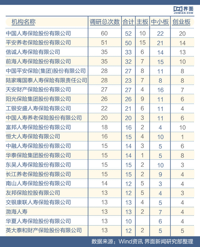根据Wind资讯给出的各保险公司关注度最高的3只股票,界面新闻研究部整理出,上述这20只股票在调研中受各家保险公司关注度最高。
