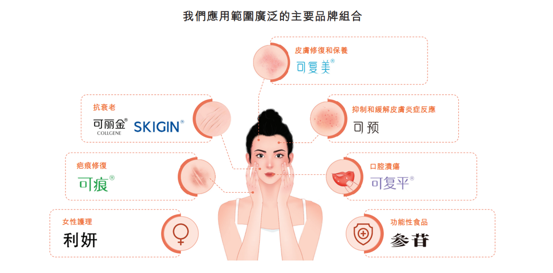 围绕这两大核心成分,巨子生物从功效性护肤品、医用敷料和功能性食品三大方向,推出了可复美、可丽金、可预、可痕、可复平、利妍、欣苷(SKIGIN)及参苷八大品牌,产品组合包括105项SKU。