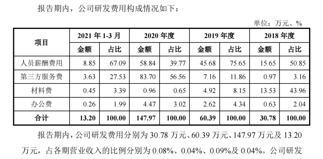 据敷尔佳招股书显示,截止至2021年3月31日,公司研发人员仅2名,占总员工数的0.69%。2018年-2021年第一季度,公司的研发投入分别为30.78万元、60.39万元、147.97万元和13.2万元,占营收比例分别为0.08%、0.04%、0.09%、0.04%,均不足千分之一,独立研发能力存疑。