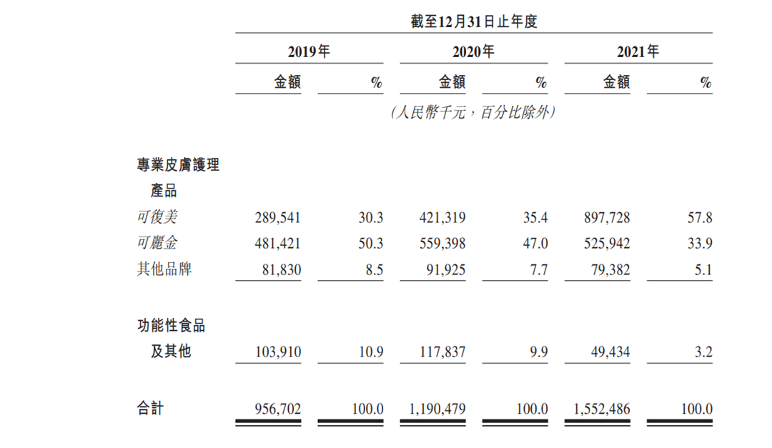 而作为巨子生物的核心品牌,可丽金和可复美也是公司的主要收入来源,且这个占比远超乎想象。据公司透露,2019年-2021年,这两个品牌下的专业皮肤护理产品贡献了公司总收入80.6%、82.4%以及91.7%的销售额。在招股书中的风险因素公司也明确指出了其过于依赖有限的品牌的销售。