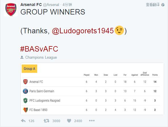 赛后,喜获小组第一的阿森纳第一时间发布官推感谢卢多戈雷茨的帮忙。