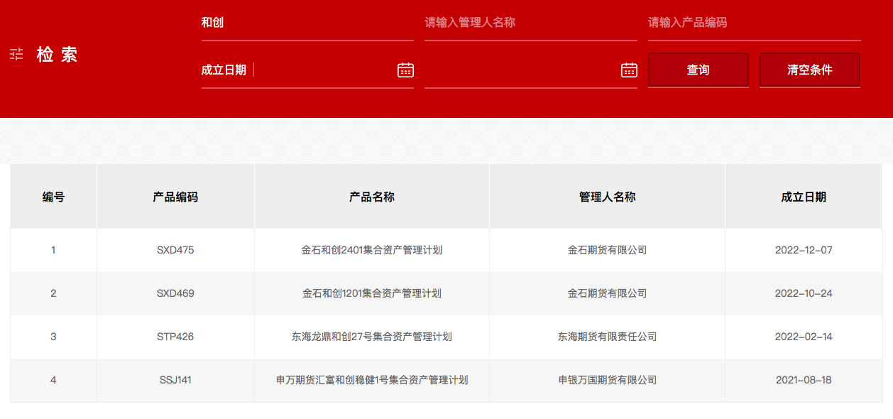 中基协网站显示,以期货公司集合资管产品为例,有4只名字中带有“和创”二字的备案产品正在运营中,分别是金石和创2401集合资产管理计划、金石和创1201集合资产管理计划、东海龙鼎和创27号集合资产管理计划和申万期货汇富和创稳健1号集合资产管理计划,管理人分别为金石期货有限公司、东海期货有限责任公司和申银万国期货有限公司。
