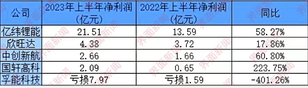 锂电池二梯队企业中,亿纬锂能(300014.SZ)、欣旺达(300207.SZ)、中创新航(03931.HK)、国轩高科(002074.SZ)上半年实现净利增长,孚能科技(002074.SZ)持续扩大亏损。