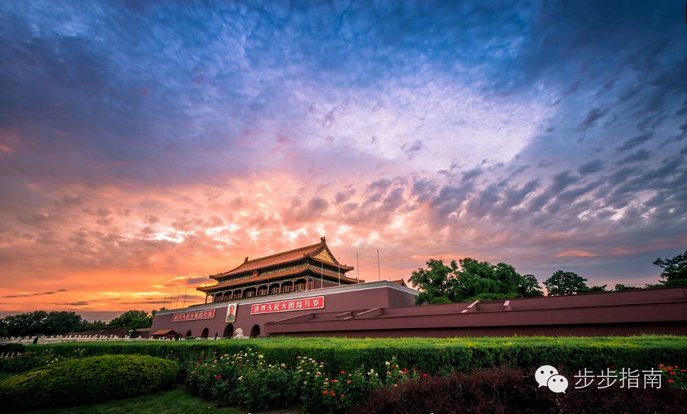 坐落在首都北京中心的天安门,一抬头便看到和蔼的毛主席像,毛主席像永远朝着四面八方的祖国人民微笑。镜头下的天安门,与火红的云朵相互映衬,愈发的庄严而神圣。步步菌一直有个期盼,在未来的某一天一定要在天安门下望着红旗冉冉升起。