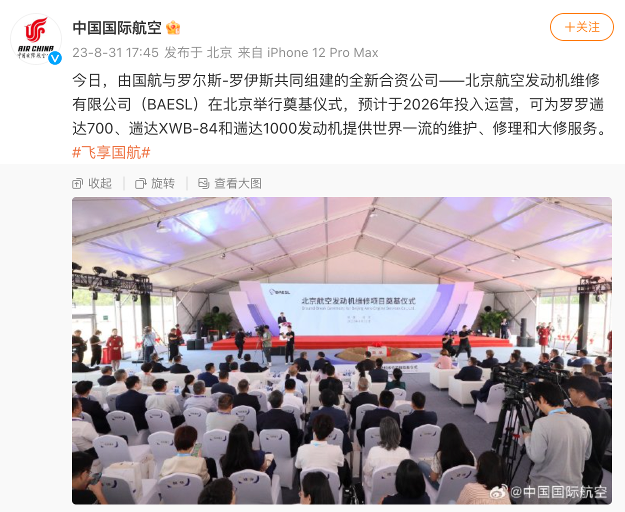 据@中国国际航空 消息,8月31日,由国航与罗尔斯-罗伊斯共同组建的全新合资公司——北京航空发动机维修有限公司(BAESL)在北京举行奠基仪式,预计于2026年投入运营,可为罗罗遄达700、遄达XWB-84和遄达1000发动机提供维护、修理和大修服务。据悉,这是罗罗全球第四家、中国内地首家合资发动机维护、修理和大修公司。