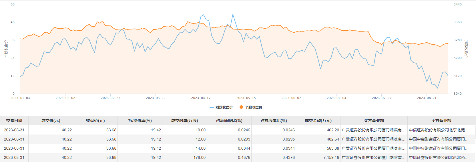 8月31日,特宝生物今日大宗交易成交214万股,成交额8607.08万元,占当日总成交额的67.77%,成交价40.22元,较市场收盘价溢价19.42%。