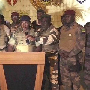 就在选举结果公布后不久,10多名军人以“机构过渡和恢复委员会”的名义在加蓬24电视台发表声明称选举结果无效,同时宣布解散政府、国会、宪法法院等国家机构,关闭国境。“机构过渡和恢复委员会”成员包括“御林军”共和国卫队军官、陆军军官和普通士兵。邦戈则被政变军人软禁。