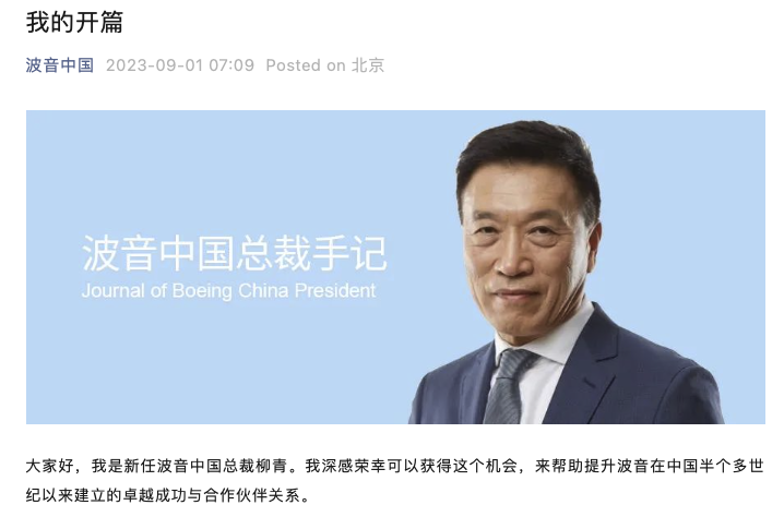 9月1日,新任波音中国总裁柳青通过波音中国官微发布《我的开篇》一文。柳青称,作为波音中国总裁,他将负责制订和贯彻波音在中国的发展和合作战略。
