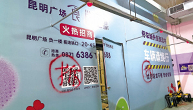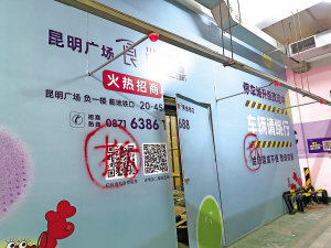 赵先生说,同德昆明广场的地下商业部分与小区A区地下停车场是连通的,在车位上修建筑,很可能之后要作为商铺出租。“之前就有一些停车位被他们修成了仓库,用来出租。”记者看到,现场部分围合起来的区域墙体上,确实打着写有“昆明广场食尚汇火热招商”等字样的广告。