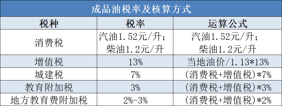 我国于1994年开始征收成品油消费税,此后又多次调整,根据目前国家的相关规定,成品油税费中主要包括这样几种类型,分别是:消费税、13%的增值税、7%的城市维护建设税、3%的教育费附加和2%-3%的地方教育费附加。我们可以通过下面的表格了解到税率明细及核算方式: