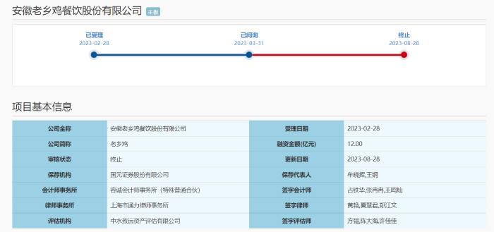 8月28日,上交所发布了《关于终止对安徽老乡鸡餐饮股份有限公司首次公开发行股票并在沪市主板上市审核的决定》,这意味着,递交申请6个月后,老乡鸡的IPO之路“终止”了。