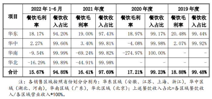 值得注意的是,虽然老乡鸡表示已经形成了覆盖安徽、江苏、湖北、上海、深圳、北京、浙江等区域的门店网络,但除了包括安徽在内的华东区域,华中、华南和华北区域餐饮毛利率基本为负,尤其是华南和华北地区,餐饮毛利率连年为负。