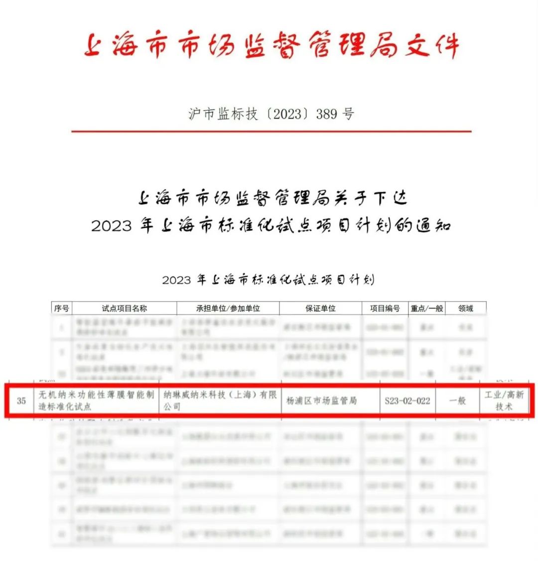 近日,在上海市市场监督管理局下发的《上海市市场监督管理局关于下达2023年上海市标准化试点项目计划的通知》(沪市监标技[2023]389号)中,纳琳威纳米科技(上海)有限公司的“无机纳米功能性薄膜智能制造标准化试点项目”,榜上有名。