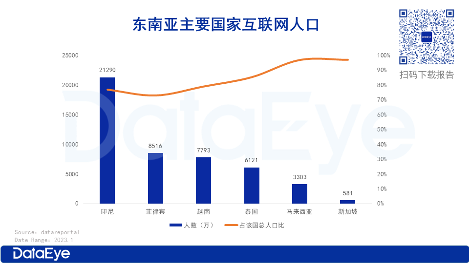 在印尼总人口中,2.129亿人可以上网(互联网人口),互联网普及率为77%。较2022年,印尼的互联网用户增长约5.2%,印尼互联网用户在东南亚各国中增长居前。